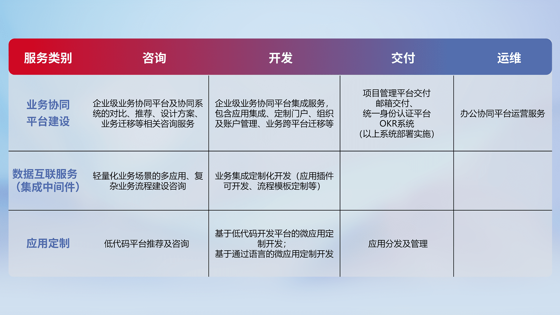 针对钉钉、、、企微、、、、IDaas等平台级产品提供产品的规划、、方案、、、、交付、、定制化开发等服务,,,实现如统一协同办公、、智能客户服务、、、、混合会议管理、、、、智能数据查询、、、等业务场景,,实现数字化转型。。